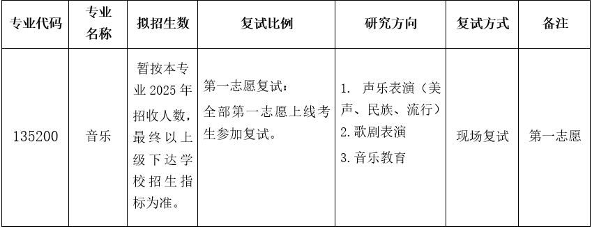 专业课知识考核、综合素质与能力考核:采用面试形式进行,重点考查考生的演唱技巧、语言表达能力、作品体式与艺术特色的分析能力,以及对道德品质、心理素质、综合素质等能力的考核。考核最终分数为去掉1个最高分和1个最低分后的其他成绩平均分(百分制,且精确到小数点后两位)。